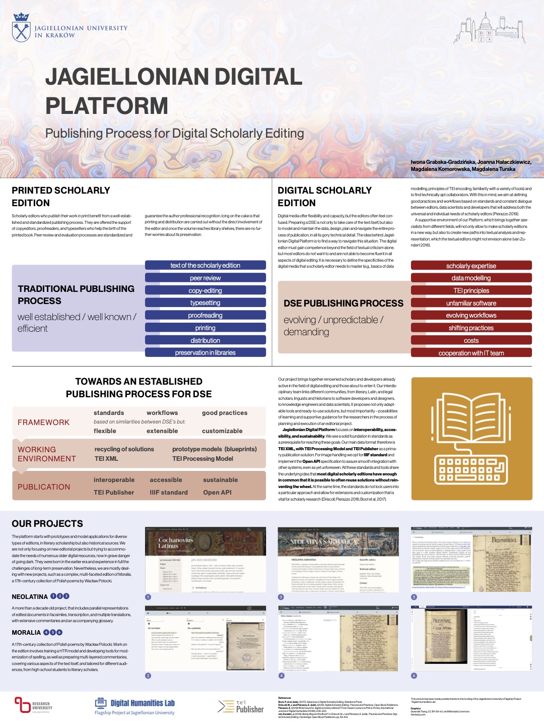 | Jagiellonian Digital Platform brings together scholars and IT developers in order to create a supportive environment for interoperable, accessible and sustainable digital scholarly editions. We want to assist scholarly editors in creating new paths into textual analysis and representation, which they might not envision alone. |