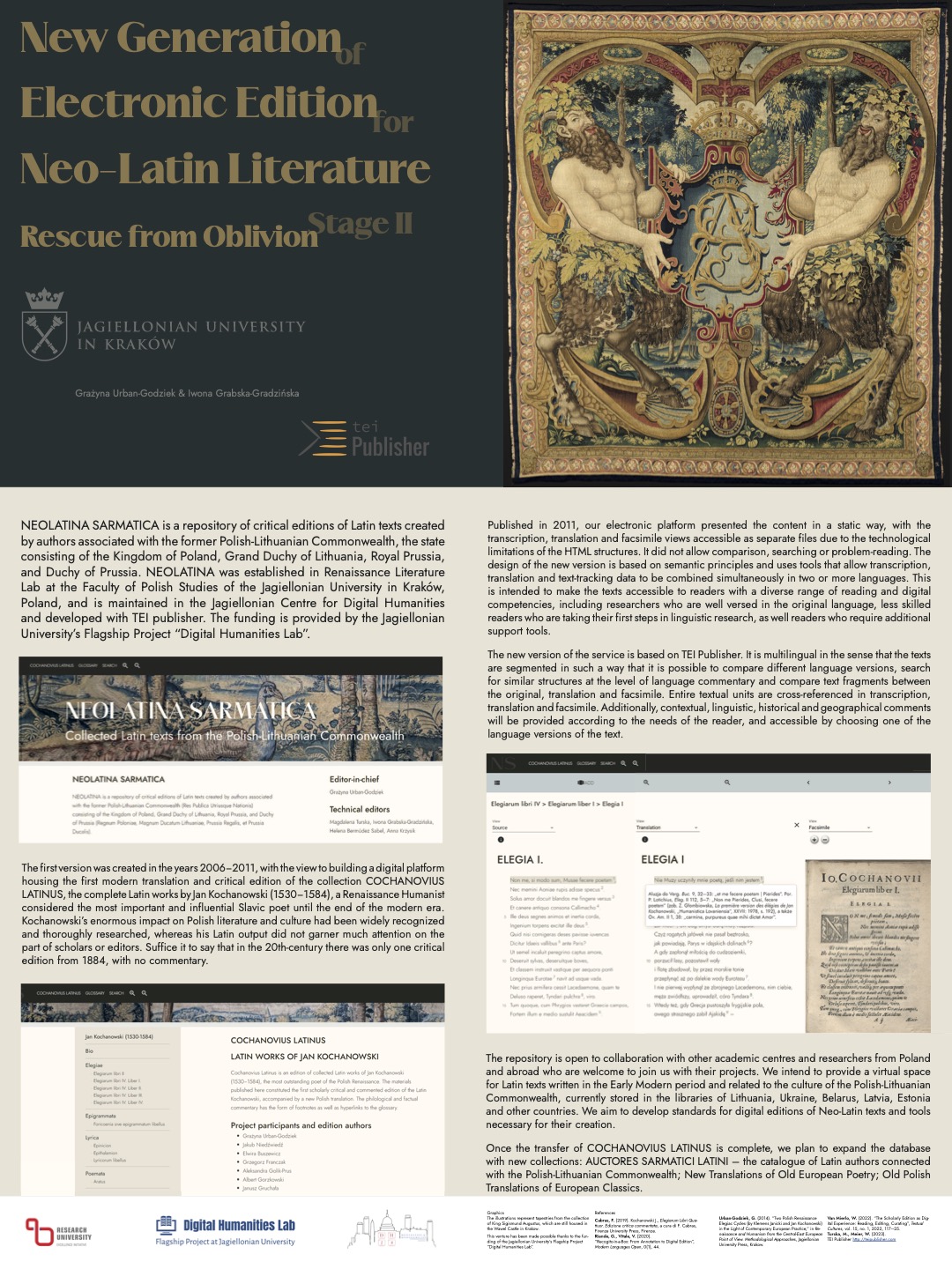 | A new version of NEOLATINA, a repository of critical editions of Latin texts created by Old-Polish authors. We transfer data from an old (2011) database to the new, based on TEI Publisher, which enables comparing language versions, searching for similarities for linguistic commentary and comparing original, translation and facsimile. |
