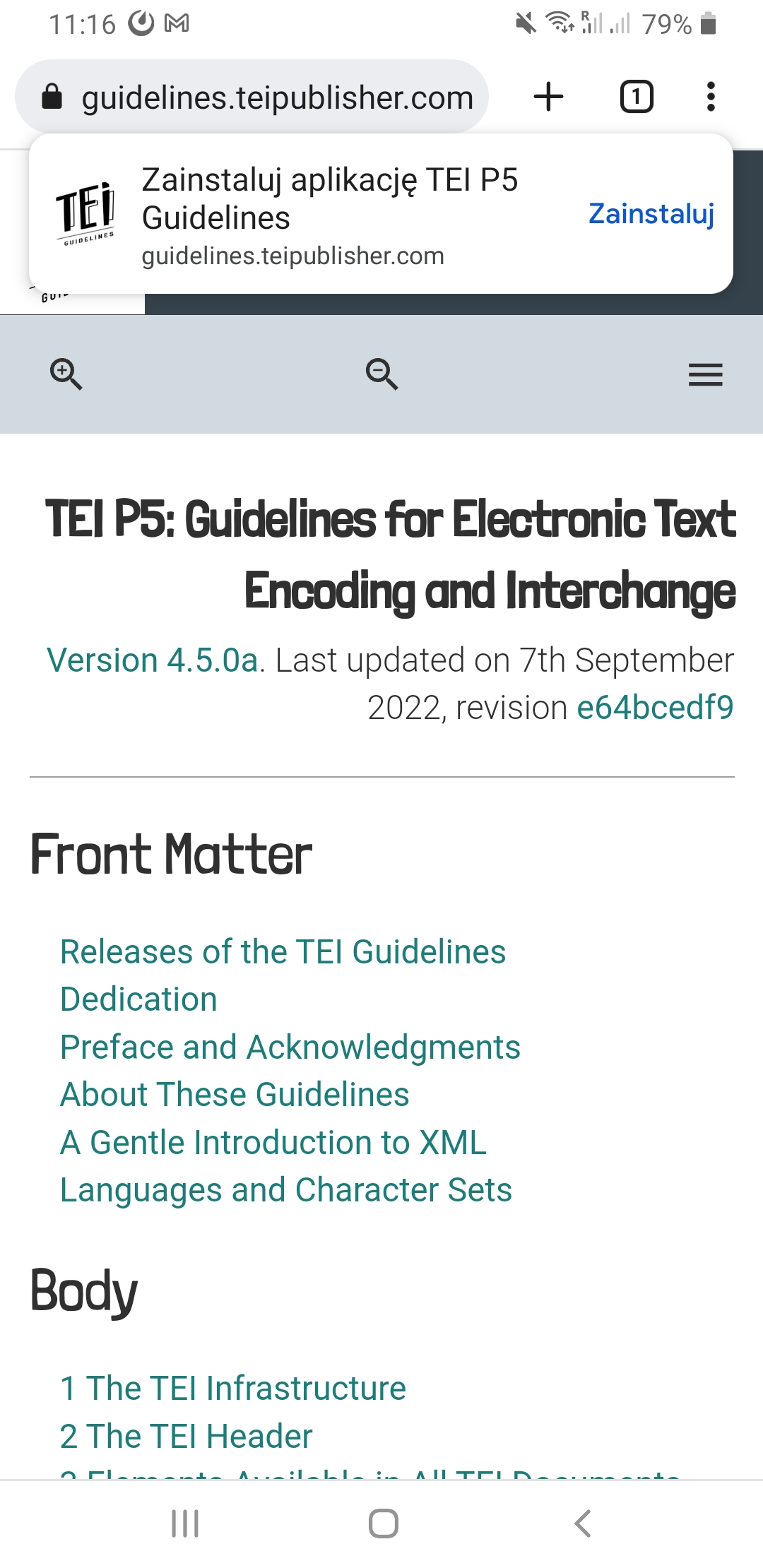 Also worth mentioning: the static version of the TEI guidelines app is a so-called progressive web app, which means you can install it as a standalone application. This is most useful on a phone or tablet as visited pages will be cached for offline use. I'm actually using the guidelines app on the phone quite often, e.g. if I have to look up something while travelling. What is cached or preloaded for offline use is fully configurable in the generator, so you could even preload all the content and be fully independent of a network connection.