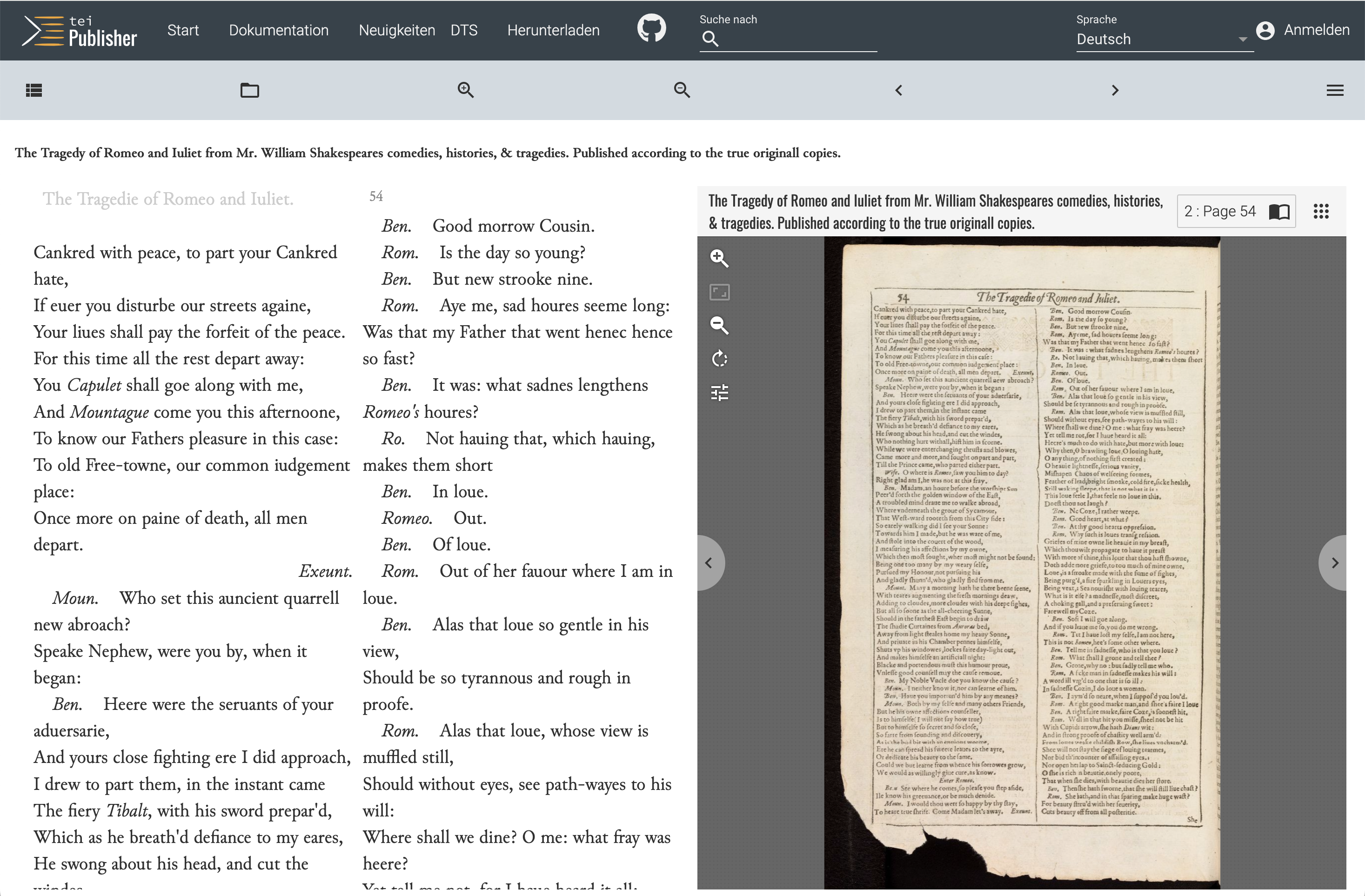 As showcased in the Shakespeare sample and app, TEI Publisher now supports generating IIIF presentation manifests and displaying them alongside the text. A presentation manifest combines a set of images together with metadata, so instead of displaying single facsimiles via the IIIF image service, we have a standardized description of all the images associated with a resource. While there are external tools for creating IIIF manifests, we can easily auto-generate them from the TEI header and page beginnings as long as those have @facs attributes from which the image service links can be determined. This is demonstrated in the Shakespeare sample but should work with any other TEI meeting the requirements.